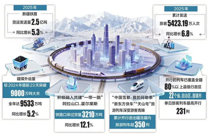 2025年,新疆铁路交出了一份亮眼的年度成绩单:全年累计发送旅客5423.19万人次、同比增长6.8%;货运发送量2.5亿吨、同比增长5.3%,客货运量双线飘红。